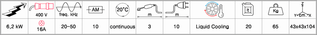 – Maximum power: 6.2kW selectable on 10 levels – Maximum current consumption: 9A – Power supply voltage: 400V – Power frequency: 50/60 Hz – Liquid cooling – Weight: 65Kg